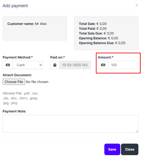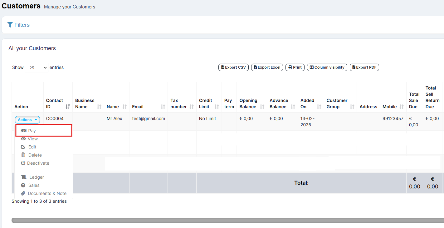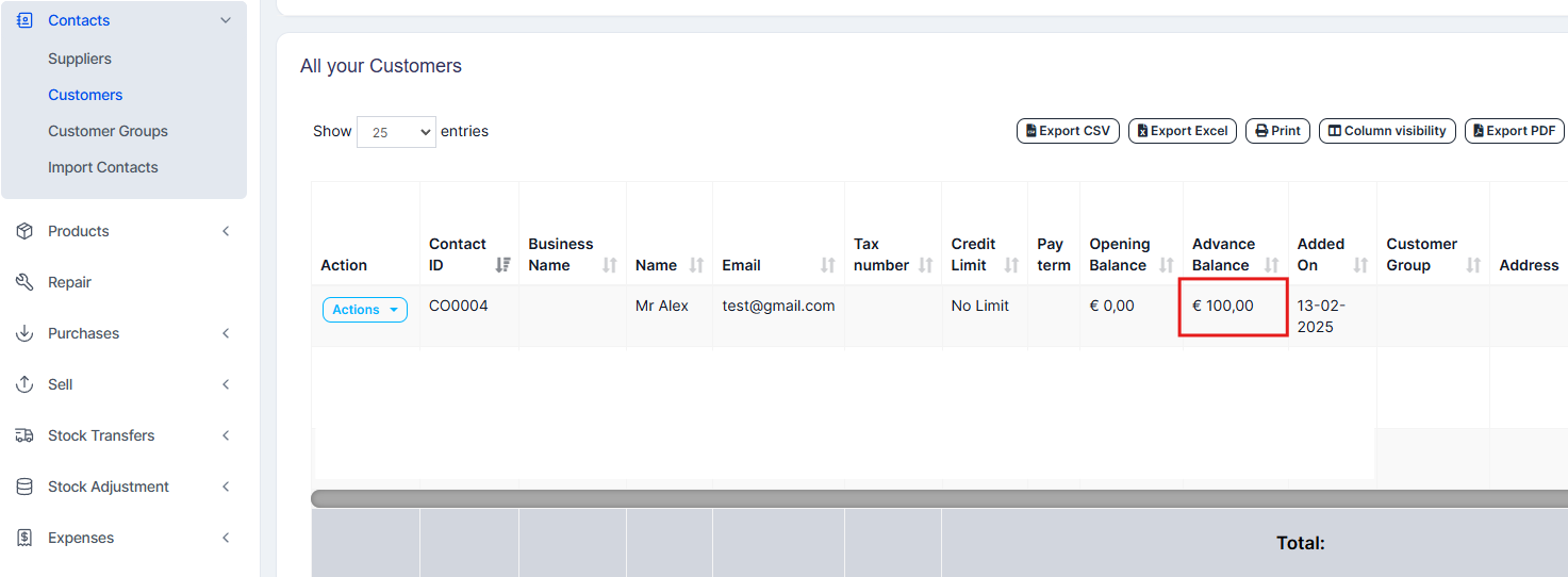 To add an advanced balance, Go to Customers -> customers/suppliers and click on the action button. Here you will find a pay option and click on it. Add payment pop up will be shown and add the required amount value and click on save button.