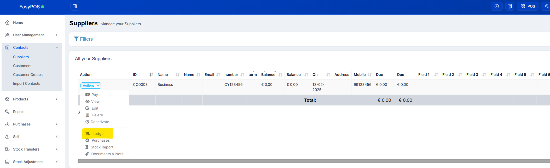 - Go to Contacts -> Supplier/Customer and click on actions button